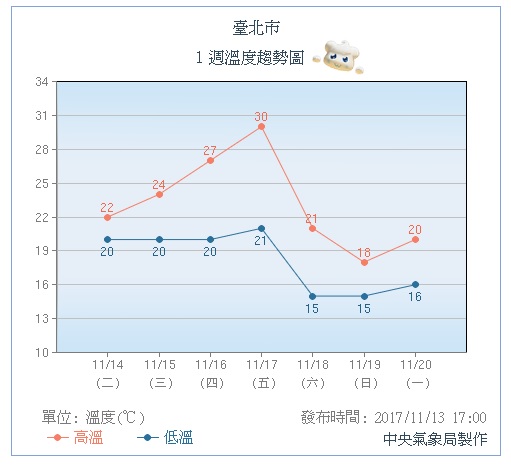 中央氣象局表示,今(13日)各地高溫比昨日略微上升,北部及東北部高溫約落在24至27度,整體偏涼,而南部降雨機率也會減緩。不過氣象達人彭啟明在臉書警告,周五(17日)高溫有機會來到30℃上下,但週六(18日)將有北方冷高壓南下,可能是今年為止最強的冷空氣,北部低溫可能降到15至16度!
