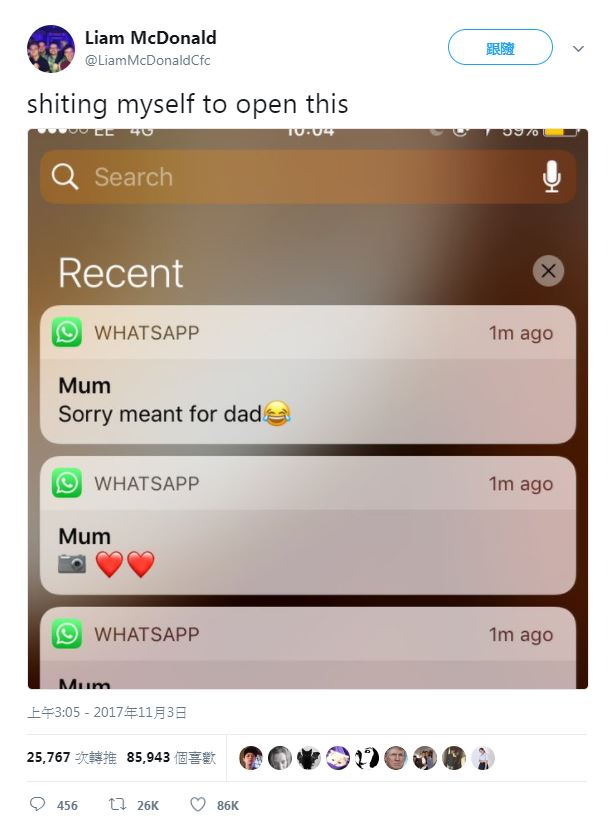來自英國的網友利安姆(Liam McDonald),驚恐地在推特發文「我嚇到挫屎不敢打開!」只見照片中,手機的訊息提示欄裡,利安姆的媽媽先傳了2張照片,隔沒幾秒又傳了1張照片,並附上2個謎樣的愛心符號。但好在媽媽發現得快,立刻傳訊息道歉表示傳錯人了,「照片是要給你爸看的啦!」