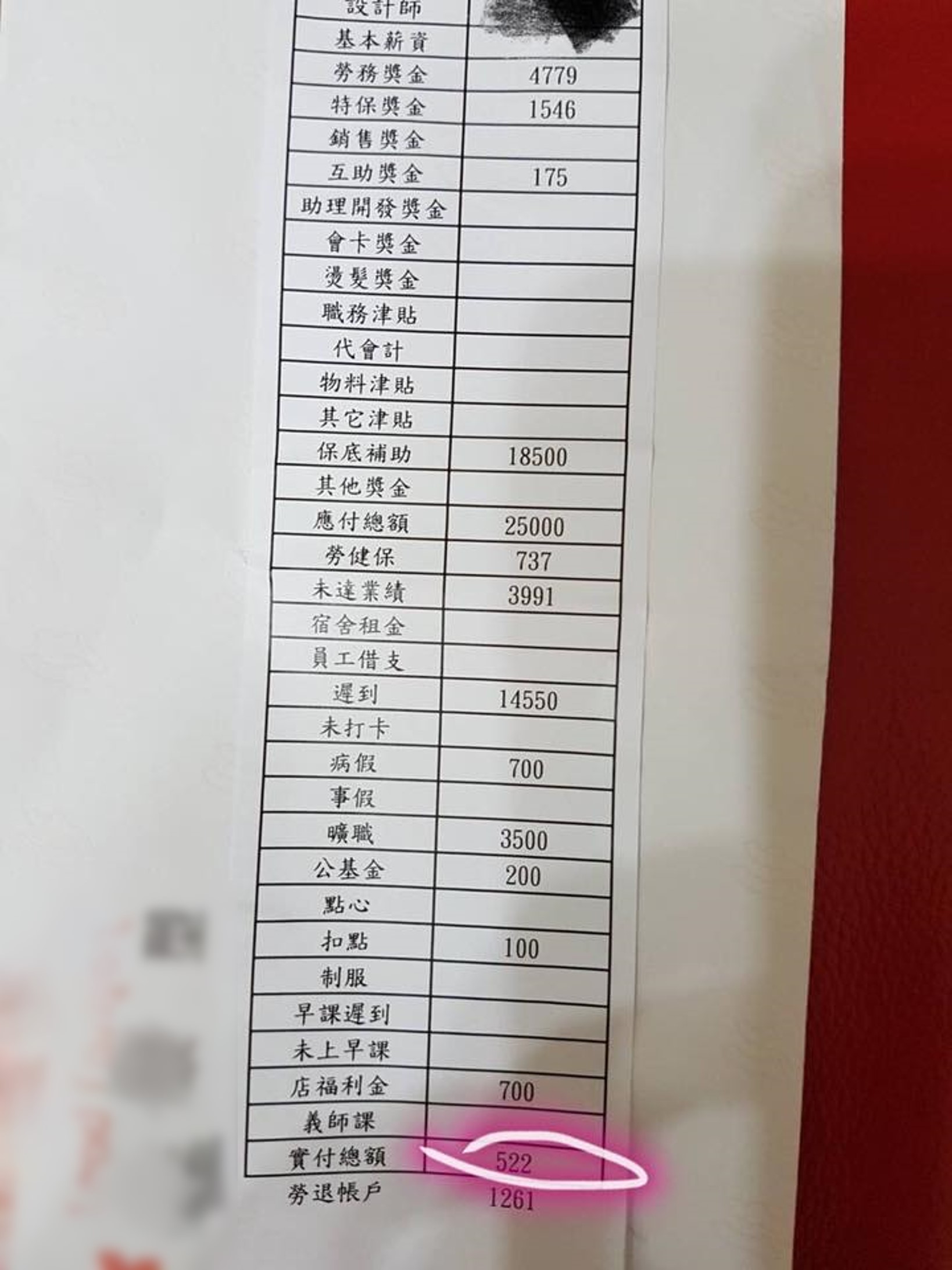 一名女網友昨(15)日在「爆廢公社」臉書PO出弟弟10月的薪資單。薪資單上顯示,本薪有2萬5000元,但光是「遲到」這一項就被扣掉1萬4550元,曠職被扣了3500元,病假被扣700元,再扣掉「未達業績」、「勞健保」等項目,東扣西扣後,薪水竟然只剩522元。