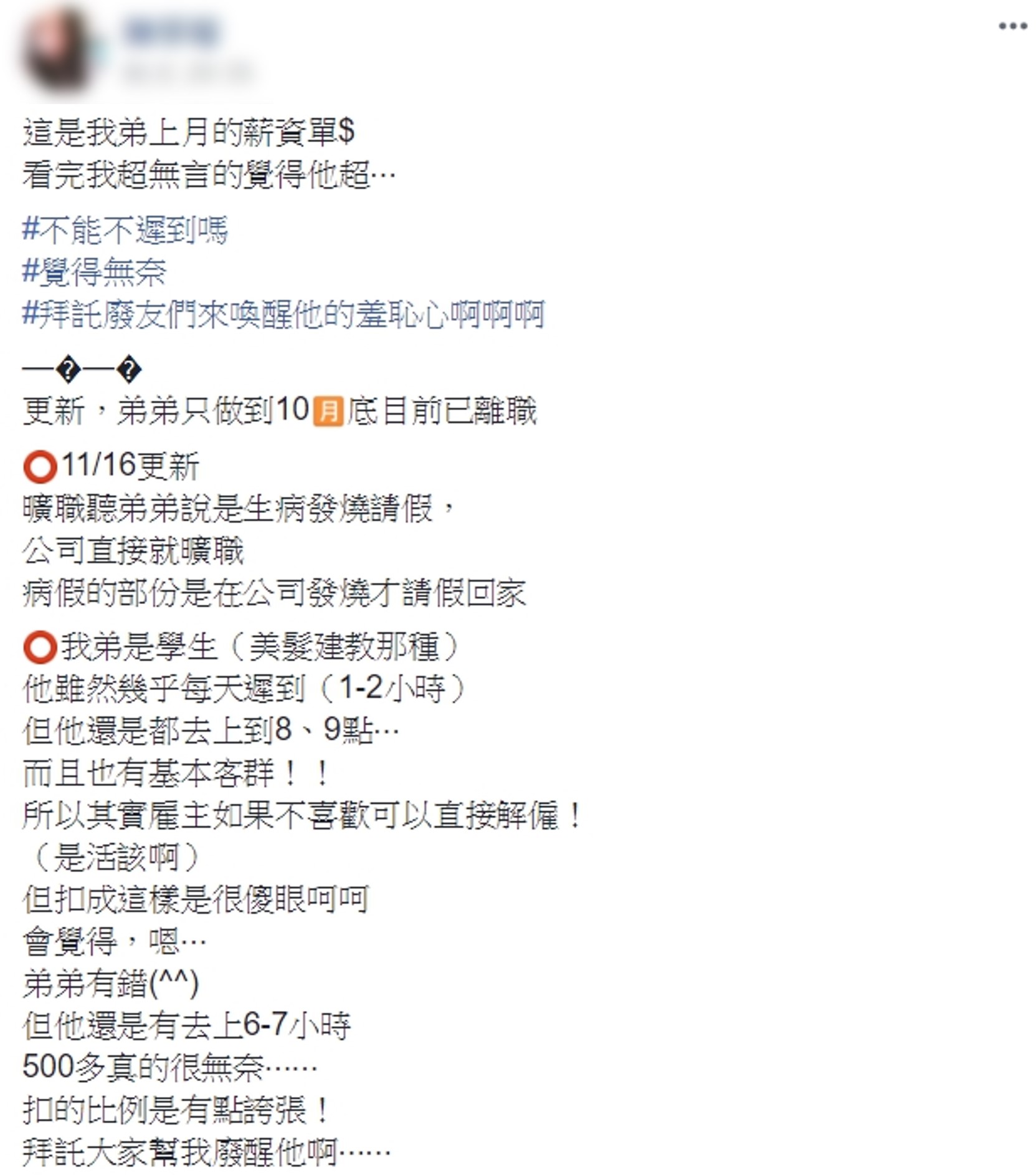女網友透露,弟弟是美髮建教的學生,雖然每天幾乎都會遲到1至2小時,但每天仍有去上班,做到晚上約8、9點,而且有基本客群,目前已經離職。女網友雖然認為愛遲到的弟弟「活該」,但仍無言表示,「其實雇主如果不喜歡可以直接解僱!但扣成這樣真傻眼,扣的比例是有點誇張!」