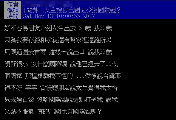 後來,原PO聽朋友說那位女生事後說他「太俗,只去過首爾,沒什麼國際觀」,也因為這樣而似乎不願再與他進一步來往,讓他覺得有些不服氣,並詢問網友「真的出國比有國際觀嗎?」