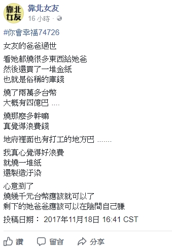 「靠北女友」中提到女友爸爸最近剛過世,而女友燒了非常多物品給父親,還買了很多紙錢,也就是俗稱的「庫錢」,換算下來女友燒了近4億元的庫錢給過世的爸爸,原PO實在看不下去,批評很浪費錢,「就燒一堆紙,還製造汙染」,更直接問「地府裡面也有打工的地方吧」,讓網友一片傻眼。