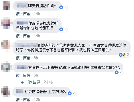 金紙上,「心意到了」就好,還說了一句「剩下的她爸爸應該可以在陰間自己賺」,此話一出讓許多網友暴怒,狂轟他「何時換你去陰間賺?」、「總覺得應該燒個女婿才對啊」、「過幾天會不會看到我的男友過世了,因為我爸說陰間缺工讀生」、「聽說下面花費高,不信,下去試試」。