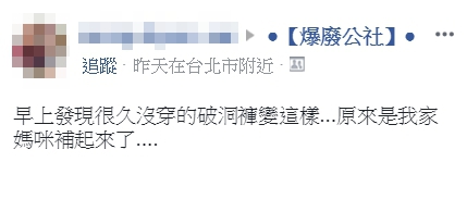 網友在臉書社團「爆廢公社」PO出牛仔褲的照片,並表示早上拿出很久沒穿的破洞牛仔褲來穿,竟發現意外的驚喜,破洞處都被媽媽補起來了。照片中,可看見左右膝蓋處的兩個破洞,都被原PO的媽媽分別以紅色、藍色的卡通圖樣補起來,整件牛仔褲煥然一新,而且獨一無二。