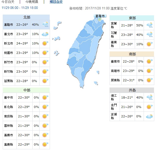 ▼明天11月28日全台天氣概況。圖/中央氣象局