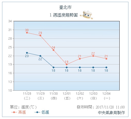氣象局指出,今明(28、29日)兩天隨著東北季風減弱,氣溫將大幅回升,北部28、29度,中南部甚至可達30、31度,降雨侷限在東半部及北部山區,西半部則是多雲到晴,中南部日夜溫差比較大,約10度左右,東半部高溫也將回升到26至28度。不過氣象局表示,周四(30日)起東北季風南下,北台灣開始轉濕涼,且清晨就是當天最高溫時刻,隨後氣溫一路下滑,周四深夜北部低溫將來到18度,和今明天兩天相比,降幅超過5度,中部略降溫1到2度,南部幾乎不受影響,高溫仍逾30度,而除中南部平地外,各地都有降雨機率。