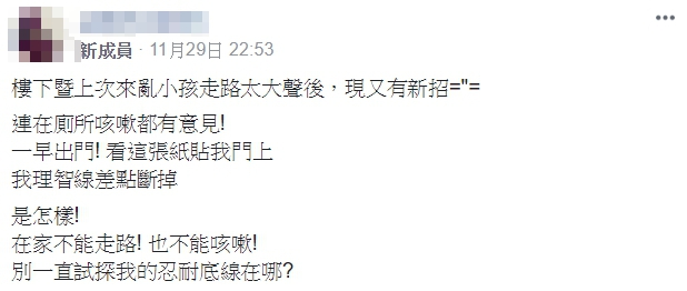 網友在臉書社團「爆料公社」發文表示,樓下鄰居先前曾抱怨小孩走路太大聲,沒想到這次「又有新招」,他一早出門就看見門上貼著一張紙條,上面白紙黑字寫著,「不要在浴室間咳嗽或清喉嚨」,即使只是1、2聲,傳到別的樓層後聲音會變大,吵醒已經進入睡眠的人。這張紙條讓網友看到後瞬間理智斷線,氣得直呼「別一直試探我的忍耐底線在哪!」