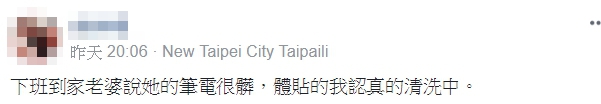 貼文PO出後,立刻引起熱議,認真清洗筆電的畫面讓網友都看傻了眼,紛紛留言表示「你是不是討厭你老婆」、「勇氣可嘉」、「你現在還安好嗎」、「您還活著嗎」、「笑死,讓我想起有看過別人的車電鍍被女友用菜瓜布刷洗」、「有刮傷…記得補漆」、「原來筆電也出防水了哦」、「你死定了,哈哈」、「樓主還活著嗎?上來報個平安吧」、「再不出聲要幫你報警了喔!」