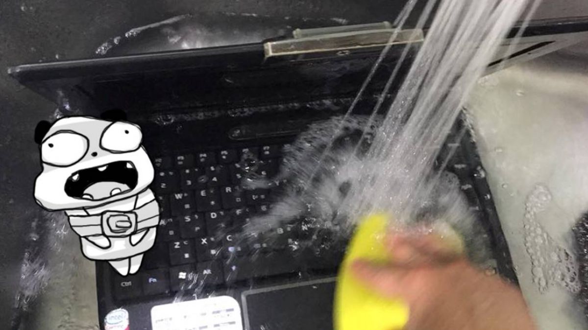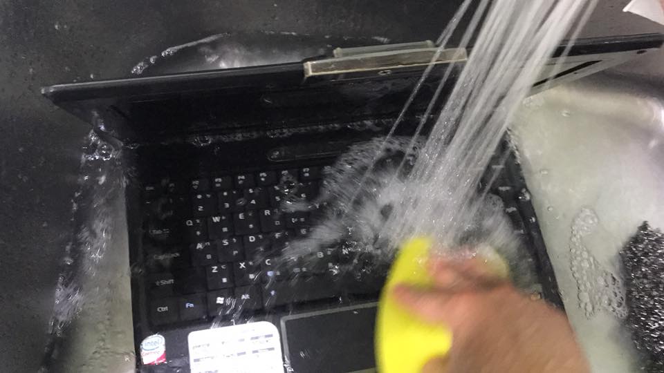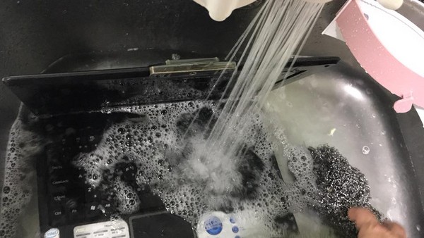 筆電很髒,於是他便貼心地將整台筆電拿進水槽,以菜瓜布