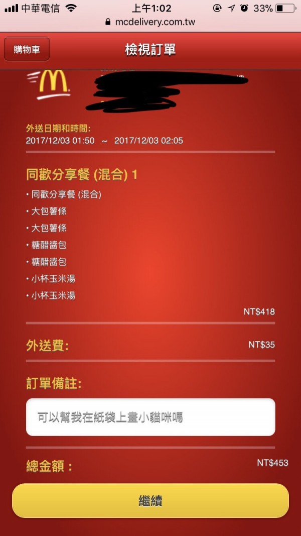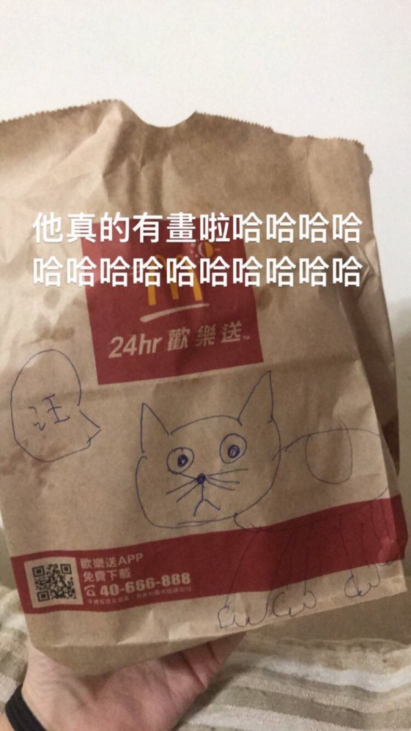 訂單備註」,可寫明有甚麼特殊需求。有一名網友訂購餐點時,突發奇想在備註的地方寫上,「可以幫我在紙袋上畫小貓咪嗎?」沒想到秉持