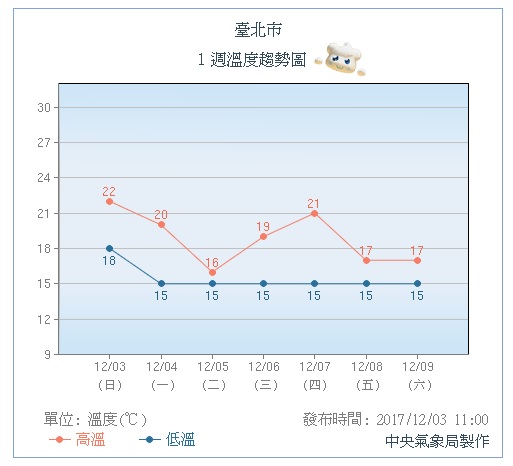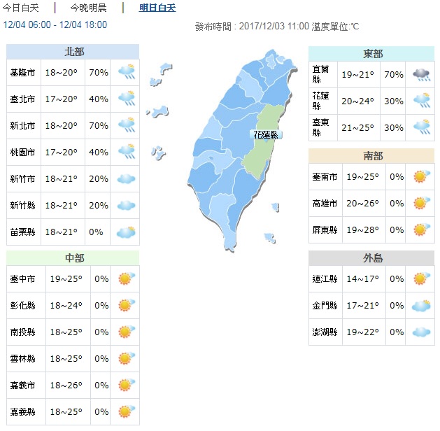 中央氣象局表示,今(3日)由於東北季風減弱的關係,全台各地的氣溫都回升了1至2度,降雨也跟著趨緩;不過到了明(4日)下半天起,東北季風將會再度增強,迎風的北部地區最低溫下探14度,要等到星期四(7日)才會好轉。但周五(8日)另一波東北風報到,挾帶更多水氣,到時不止北部,就連中南部都會下雨!