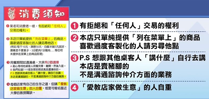 豬腳店消費須知,第一點就寫明「業者和消費者一樣,有拒絕和『任何人』交易的權利」還有不提供客製化的要求,例如白飯半碗5元、燙青菜不要葉子、3分肥肉7分瘦肉等要求,店家都無法提供,店家也不會幫忙跟客人喬位子。