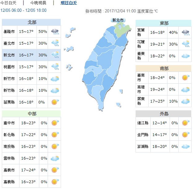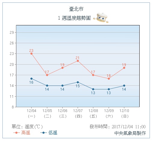 氣象局表示,今(4日)起東北季風增強,東北部有雨,北部及花東有局部短暫雨,其他地區多雲到晴,北台灣將從上午的20度下降到入夜的16、17度,其他地方白天仍不受影響,中南部高溫約26至28度,花東24、25度。但入夜後就轉涼,明後天(5日、6日)受東北季風影響,北台灣偏濕涼,其他地區為多雲到晴,明天白天氣溫較低,北台灣介於16至18度間,明晚上到後天清晨為這波冷空氣最強時刻,中部以北將下探14、15度,南部及花東則在16至18度,預計周三白天氣溫小幅回升2度,但北台灣仍然偏冷、其他地區感受較涼。