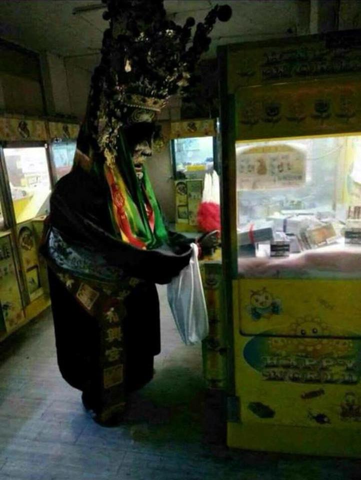 一名網友在臉書不公開社團「爆廢公社」PO出照片,畫面中陣頭常出現的「八爺」站在夾娃娃機前,右手掛著塑膠袋,專注的操作機器,這新奇的景象令原PO不禁想問,「兄弟
