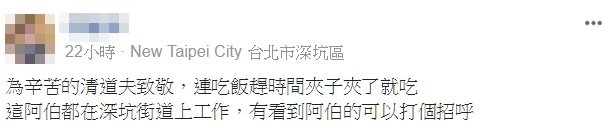根據《ETtoday》報導,原PO表示,當時開車經過深坑雲鄉路看見這位阿伯,因該處位於半山腰,當天天氣很冷、風很大,看見阿伯衣物單薄,似乎還不覺得冷,並未蜷曲身體,大概已經習慣這樣的天氣。原PO就這樣在車上靜靜看了阿伯10分鐘,也不敢打開窗戶,深怕打擾到阿伯用餐。雖沒下車前去關心,心中卻對阿伯充滿敬佩,也希望社會大眾能看見基層人員的辛苦。
