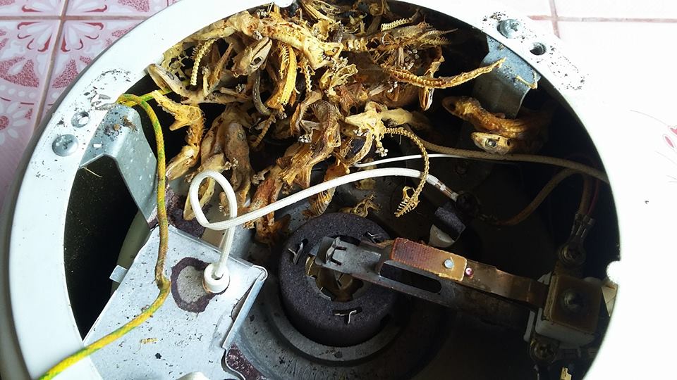 壁虎乾屍,有些壁虎的頭部還能清楚看見,有些則陳屍許久,只剩下乾淨的骨頭,數量共有10到20隻,全都如魚乾般焦脆,畫面十分驚悚,有網友開玩笑,說這根本是大規模謀殺。《Mobile 01》也曾有網友說明,因為壁虎是冷血爬蟲類,所以常會以電器當作巢穴,像是電腦的電源供應器、開飲機、電熱水器的後面都很有可能藏著壁虎,要小心的是,有時傳出燒焦味,就要去收屍了。