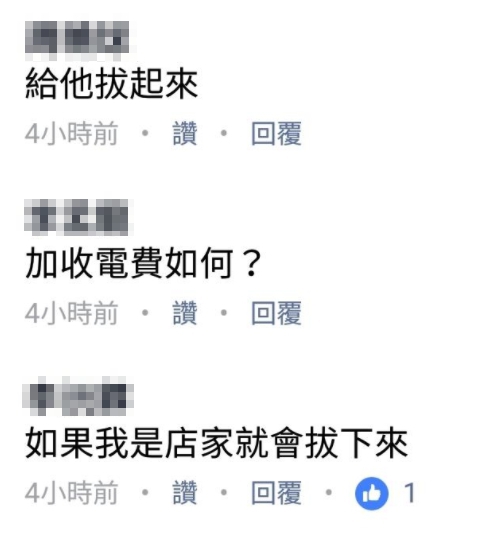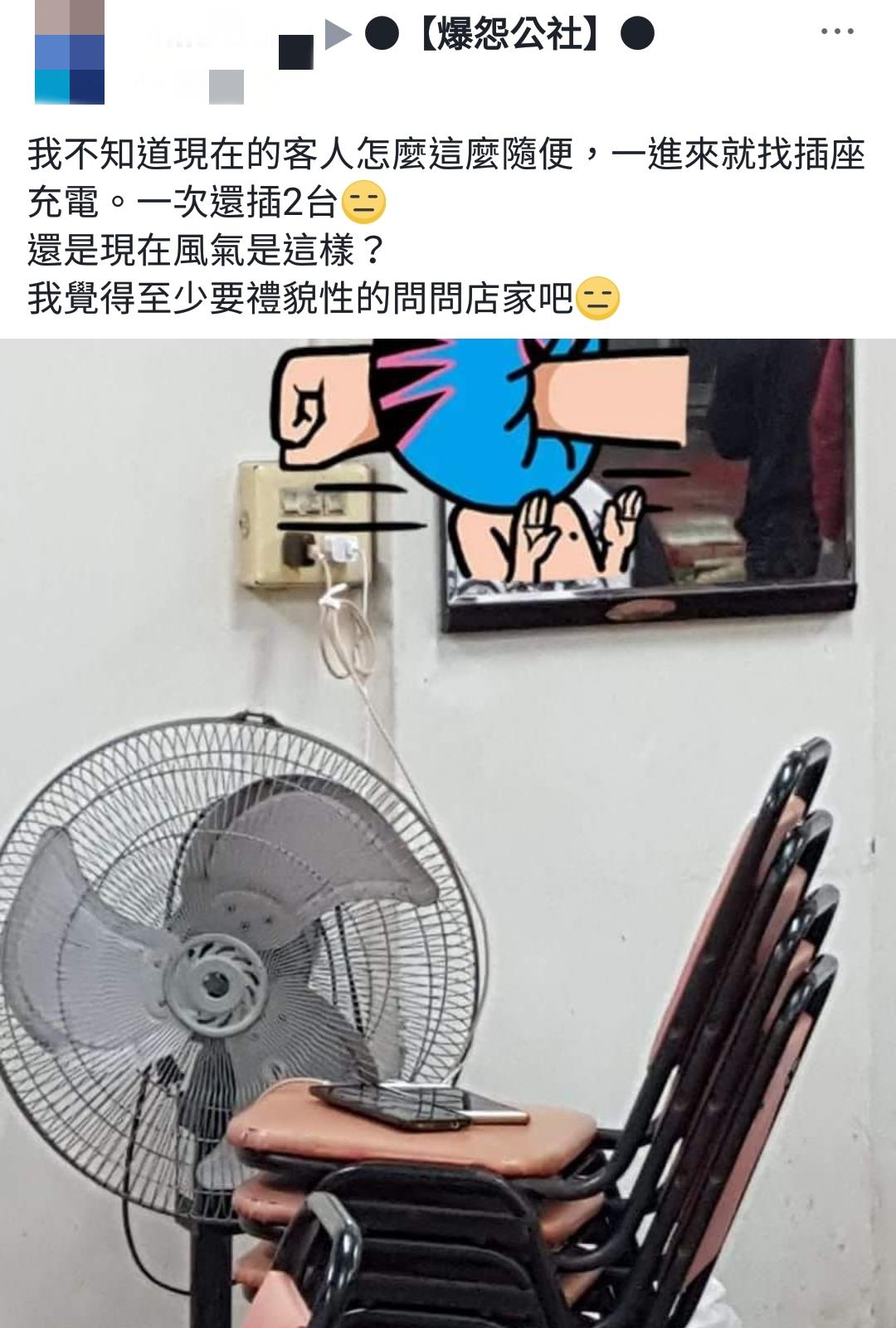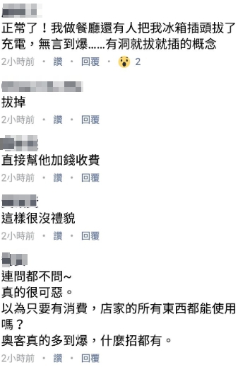 許多網友們看了紛紛抨擊「這樣很沒禮貌」、「以為只要有消費,店家的所有東西都能使用嗎?」、「收電費!」、「你家就是我家的概念」。