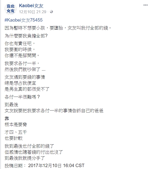靠北女友」PO文表示,女友懷孕了,他因為暫時不想要有小孩,因此兩人商量好要做墮胎手術,但女友卻要他負擔全部的費用,讓他覺得不滿,進而要求應該要AA制,結果兩人就因此大吵一架。