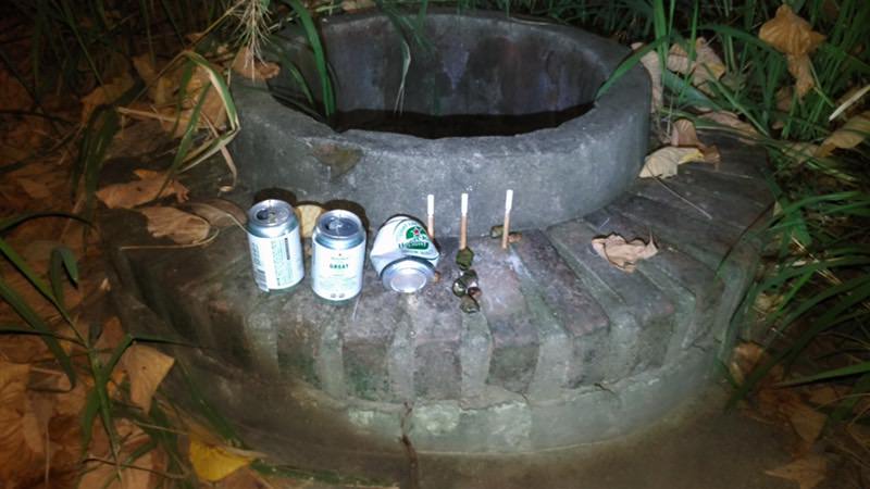 原PO途中拍下許多照片,有些放置已久腐敗的水果與便當,據傳女僕輕生的井周遭,發現有3瓶酒及3根菸,菸還像插香一般立起來,軍營內部的鐵皮上被畫上紅色的「六芒星」。此外,原PO還走到廢棄的別墅外,雖然年久失修,但外觀仍看得出很氣派。
