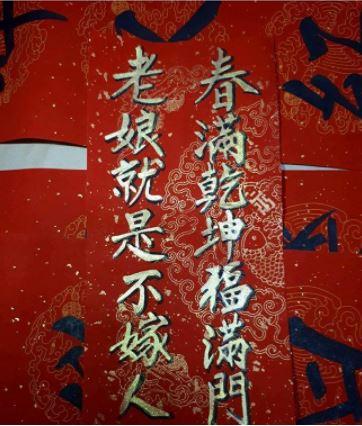 這名網友在「爆廢公社三館」貼文,表示她的阿伯送她一幅春聯,只見常見的春聯「天添增歲月人增壽,春滿乾坤福滿門」竟被改為「春滿乾坤福滿門,老娘就是不嫁人」,搭配上剛健、氣勢十足的金色毛筆字,令不少網友捧腹大笑,原PO則說,「今年我的門口會貼這個,所以不要再問我怎麼不嫁惹(了)」。