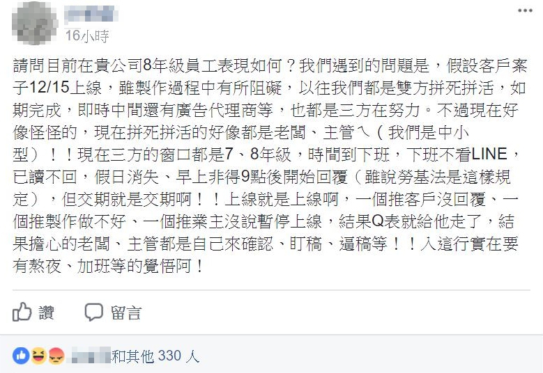 雖然這些7、8年級生的做法是在勞基法的規定,但許姓業主認為「交期就是交期啊!!上線就是上線啊!」並抱怨員工只會用、客戶沒回覆、業主沒交代等理由推卸責任,最後老闆、主管們在擔心之下,只好親自出馬確認、盯稿、逼稿,讓他無奈地表示「入這行實在要有熬夜、加班等的覺悟阿!」。
