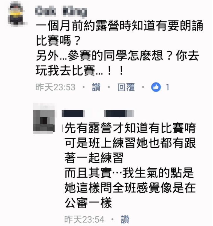 《爆料公社》發文,表示朋友的女兒早在朗讀比賽時間出來前,就和舞蹈班約好要一起去露營,沒想到比賽和露營撞期,讓她不得不放棄比賽,但身為班級的一份子,女童仍全程與班上同學一起練習。