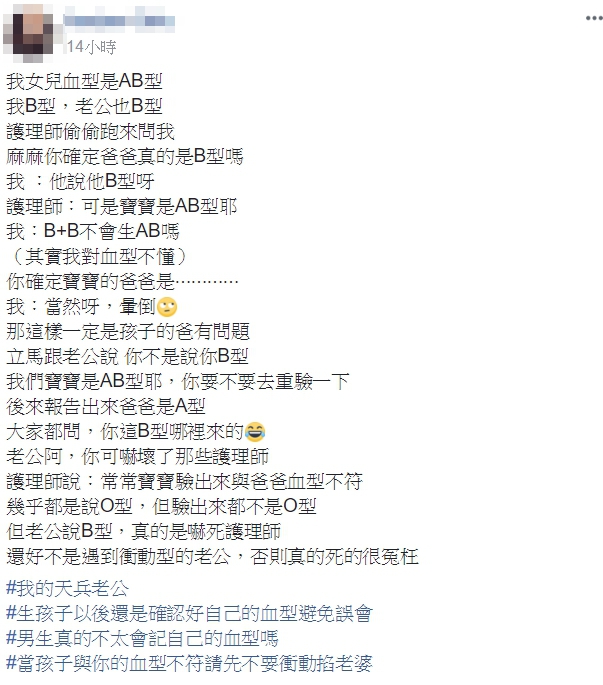 爆廢公社」PO文表示,護理師驗出嬰兒的血型是AB型後,委婉地偷問她,是否確定老公就是寶寶的爸爸,原PO聽了雖然傻眼,卻堅定地說「當然」,但若父母血型都是B型,不可能會生出AB型的孩子。