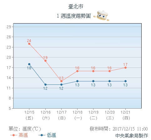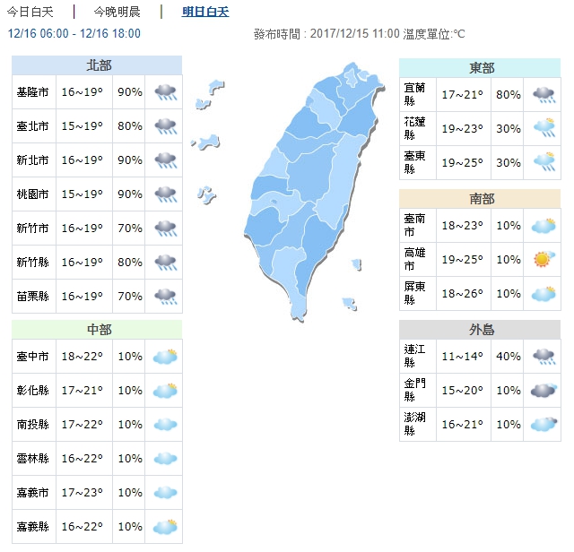 今(2017)年入冬以來的首波「強烈大陸冷氣團」將於周日(16日)一大早開始,由北而南逐漸壟罩全台,並且將持續影響到21日,氣象局預估,週日(17日)至下周一(18日)為此波冷氣團威力最強的時候,中部以北低溫下探11度,受輻射冷卻效應影響,中部低溫下探12度、南部下探14度、宜蘭下探13度,花東地區則出現低溫16,除高屏地區外,各地高溫普遍不到20度,整天偏涼。