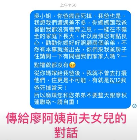 不久後,原PO的爸爸就過世了,讓人氣憤的是,喪禮的白包、勞健保和保險理賠金全都被可惡的廖阿姨領走,她甚至擅自燒掉遺照,還胡扯是葬儀社做的,此外,還明目張膽地帶著前夫的兩個小孩住進爸爸的房子裡。原PO表示,其實爸爸在過世前就已經開始提防廖阿姨,認為她拿到錢後可能就不會再照顧兩個同父異母的弟弟,沒想到都被料中了。當她傳訊息給廖阿姨的女兒時,對方卻跑去告狀,後來廖阿姨還用原PO同父異母的弟弟臉書傳訊息給她,要她別再找弟弟,並說弟弟是她生的,要不要養是她的事情,直嗆「妳沒資格管」。