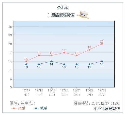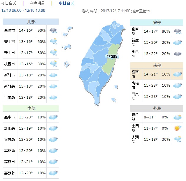氣象達人彭啟明今天在臉書PO文,受到強烈大陸冷氣團南下影響,今晨淡水出現11.3度低溫,北台灣低溫普遍降到11至12度左右,加上風勢強勁,這一波冷空氣降溫可說是全台有感,今晚到明晨(17日到18日)要持續留意低溫狀況,北台灣仍有可能降到11度中部13度,南部及花東15至16度左右。彭啟明表示,今天持續受到強烈冷氣團影響,空氣稍微轉乾,迎風面的北部、東北部、東部還是比較陰霾,並有小雨或飄雨機會,中南部則是多雲到陰為主,水氣不是很夠,中部高山降雪機會不大,白天各地較偏冷,尤其北部高溫僅13至15度,中部以及花東約17至19度,南部稍微好一點,有機會超過20度以上。