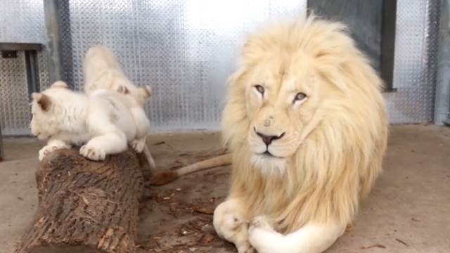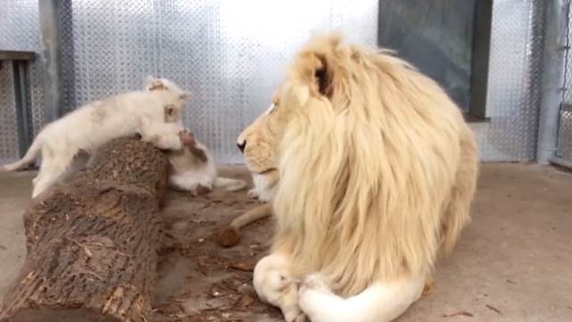 白獅四胞胎,生性活潑且非常愛玩,最近動物園公布了一段影片,片中小白獅們開心的在老爸身邊