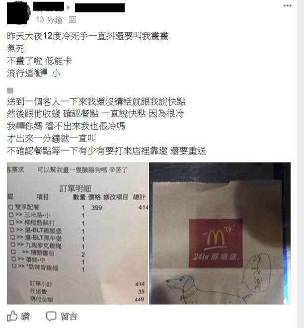其他網友紛紛留言,「要求畫那個一點意義也沒有,不知道到底為什麼要跟風」、「不畫害人家不能PO低卡、FB、IG,然後被客訴怎麼辦」、「最靠北的是,紙袋他們拍照打卡完就揉一揉丟掉了」、「根本無聊當有趣」、「被客訴就經理扣錢」。另外,留言中有位網友還分享,「之前留言請外送員順便買水,結果也沒有買欸」,更引起網友撻伐,認為外送員根本沒有義務「順路」幫忙買東西。