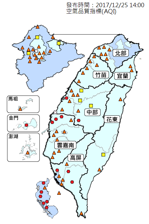 根據行政院環境保護署的空氣品質監測網顯示,截至下午2點以前,全台有15個地區達到紅色的「對所有族群不健康」,其測站包括線西、竹山、崙背、麥寮、台西、橋頭、屏東、潮州、楠梓、左營、前金、前鎮、復興、小港和金門;黃色「普通」的測站只有基隆、陽明、新莊、豐原、大里、埔里和關山這7個地區,剩下其他地方全都是橘色的「對敏感族群不健康」。