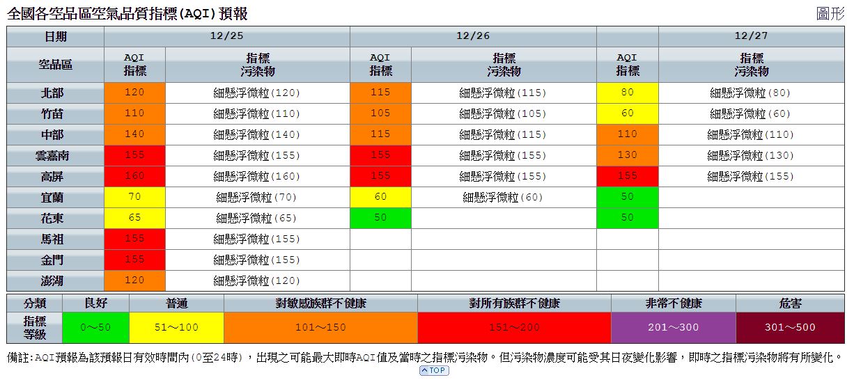 今天中部以北會達到橘色提醒等級,中部以南和金門、馬祖地區則會到紅色警戒等級,宜蘭、花東是黃色普通等級;明天(26日)則因為大陸冷氣團減弱,氣溫明顯回升後讓西半部擴散條件變差,中部以北將是橘色提醒,中部以南仍有機會達到紅色警戒,宜蘭維持黃色普通,花東則有機會變回綠色良好的狀態。
