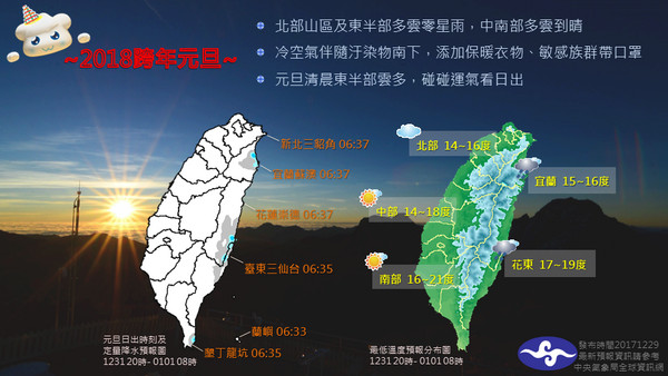 至於迎新年要追曙光則得碰碰運氣,因為假期北部、東半部雲量偏多,會有短暫飄雨,但清晨中南部多雲到晴,見到曙光的機率大,還是有機會在雲縫中看見。