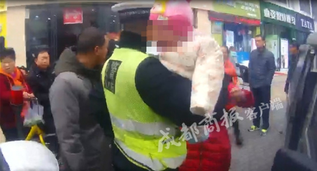 開單。車主見到被開單,馬上跑去找交警理論,但遭交警拒絕撤單,一怒之下竟將妻子手中的6個月大孫女搶來當暗器,往警員身上狂砸,砸到孩子都痛哭了,就開始大喊,「警察打小孩!」
