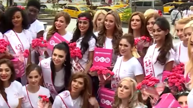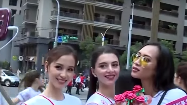 桃園有場選美活動,來自80國的佳麗上街募款做愛心,讓經過路人相當驚豔。