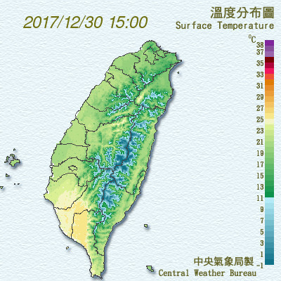 跨年夜到元旦1月1日清晨是這波冷氣團威力最強的時候,台南以北及宜蘭低溫將下探14℃、15℃,高屏及花東地區則在16℃、17℃。