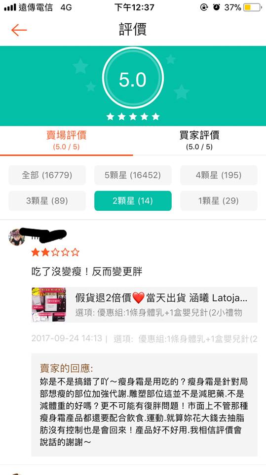 瘦身霜時,看到一款產品評價極佳,幾乎都是5顆星,但有零星幾個評價特別低,其中一個2顆星評價的顧客就不客氣地寫下「吃了沒變瘦,反而更胖!」賣家立刻傻眼回覆「你是不是搞錯了啊?瘦身霜是用吃的?」