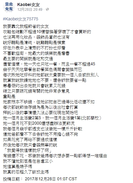 省過頭?一名男網友在臉書粉專《Kaobei女友》上