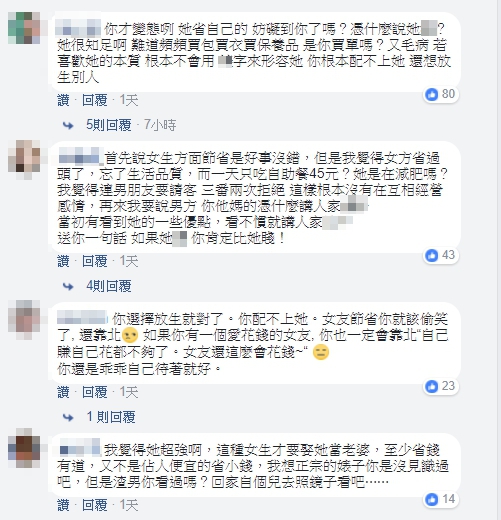 而此文一出,引起網友的正反論戰,有網友認為,男方的陳述方式太偏激,「你才變態勒!她省自己的,妨礙到你了嗎?她很知足啊,難道頻繁買衣買包買保養品,是你買單嗎?有毛病!你根本配不上她,還想放生別人」、「你選擇放生就對了,你配不上她。女友節省你就該偷笑了,還靠北!如果你有一個愛花錢的女友,你也一定會靠北『自己賺自己花都不夠了,女友還這麽會花錢?』你還是乖乖自己待著就好」,也有人很敬佩女方,「我覺得她超強啊!這種女生才要娶她當老婆,至少省錢有道,又不是佔人便宜的省小錢。渣男你看過嗎?回家自個兒去照鏡子看吧!」、「X!快放生!不要耽誤她好嘛!」