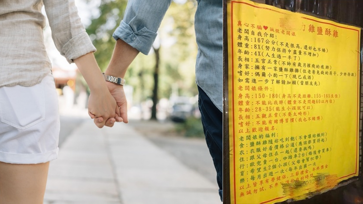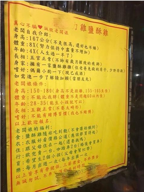 鹽酥雞老闆自稱身高167公分,體重80幾,年齡已過40,還形容自己「不帥,有歲月摧殘的痕跡」,目前經營一家鹽酥雞攤,「住老爸免錢的房子,少許存款」,平日興趣是小酌,在此誠徵老闆娘,希望有興趣的女性可以加LINE進一步了解,另外也開出了要成為老闆娘的5大條件,身高需介於150至180公分,體重不可比他重,必須28到35歲,至於外貌沒有過多要求,只求「不要太畸形」,且嚴禁賭博。