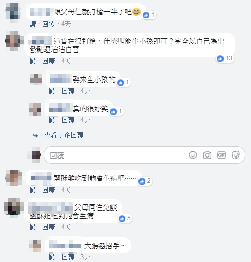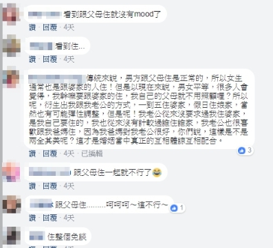 雖然老闆開出的福利都不錯,但網友們普遍認為「跟父母住一起就不行了」、「住整個免談」、「男人不懂婆媳之間,跟自己媽媽都嘛好」,因此有網友提出自己對於婚後該住哪的想法,「以現在來說,男女平等,很多人會覺得,我幹嘛要跟婆家的住,我自己的父母就不用照顧喔?所以呢,衍生出我跟我老公的方式,一到五住婆家,假日住娘家」。另外,網友有意見的不只這點,還有人覺得「什麼叫能生小孩即可?完全以自己為出發點還沾沾自喜」、「娶來生小孩的」。