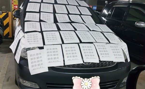 女網友在臉書社團《爆怨公社》PO文表示,自己日前去了高雄市鳳山區一間大賣場停車購物時,發現了有一輛車被管理員貼滿了「
