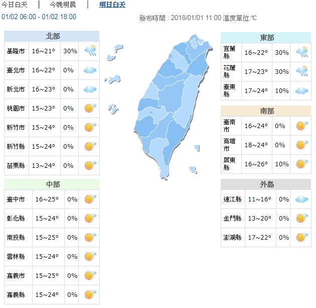 冷氣團影響下,嘉義出現13.5度低溫,其他地區則在16、17度左右,感受普遍都偏冷,白天冷空氣將逐漸減弱後氣溫略升,桃園以北及宜蘭高溫約18、19度,其他地區則在20度以上,中南部及台東更可以來到23至26度,感受較為舒適。明、後兩天冷氣團減弱、氣溫回升,周五(5日)再有一波東北季風增強,北台灣氣溫略降!