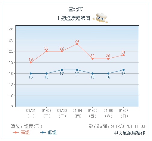 ▼這波冷氣團威力影響台灣最劇烈的時間已過,白天北台灣高溫回升至20度。圖/中央氣象局