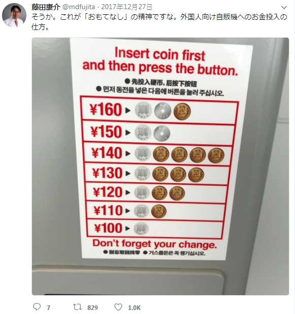 推特上,一名日本男網友表示終於明白,日本人的「好客」,只見他將一張圖片PO上網,圖片上用中、英、韓文親切的教導外國遊客如何使用自動販賣機,首先要「先投入硬幣,後按下按鈕」,接著就看到100到160的數字旁邊,用100