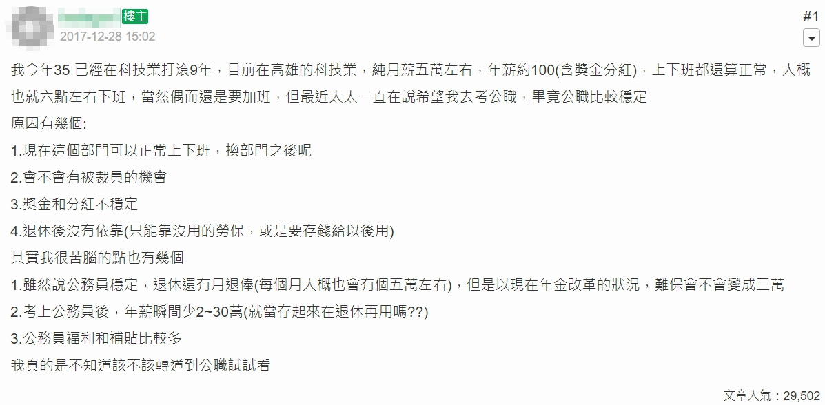 mobile01上分享,自己在科技業打滾了9年,目前在高雄的科技業,上下班規律、正常,大約6點左右就可下班,偶爾才需要加班。薪水部分,純月薪約五萬左右,年薪含獎金分紅約100萬,但老婆一直認公職比較穩定,所以認為他應該去考公職,理由包含現在所待的部門雖然可以正常上下班,但換部門後就不敢保證、日後也可能會有被裁員的機會、獎金和分紅不穩定、退休後沒有依靠,必須要存錢留給未來使用。