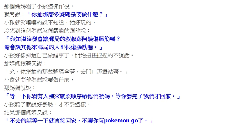 正當原PO認為小孩的行為會造成郵局作業困難、不知道媽媽會如何處置時,媽媽就問小孩「你抽那麼多號碼是要做什麼?」小孩則嘻皮笑臉地說自己是抽好玩的,媽媽一聽到後,皺著眉頭嚴肅地說「你知道這樣會讓郵局的叔叔跟阿姨傷腦筋嗎?還會讓其他來郵局的人也很傷腦筋喔。」接著,媽媽要小孩拿著號碼牌去門口站著,並要他把號碼牌照順序發給進來的人、全部發完後,才帶他回家。小孩聽了開始扭扭捏捏、不想照做,結果媽媽卻使出神招,警告「不去的話等一下就直接回家,不讓你玩pokemon go了。」
