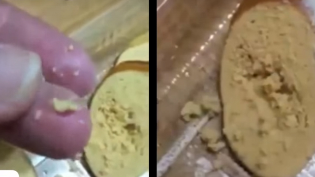 筷子怎壓魚卵都不斷,用手捏也沒有魚卵該有的顆粒,仔細看不只粉粉的形狀不對,連魚卵外膜也沒有該有的血管,顏色極不自然,民眾到基隆碧砂漁港熟食攤,買了這盒號稱是魚卵的東西,乍看之下覺得外型怪怪的,還跟老闆確認再確認。這盒從碧砂漁港買來的魚卵,到底是不是真的鱈魚子,我們送來實驗室檢驗看看。